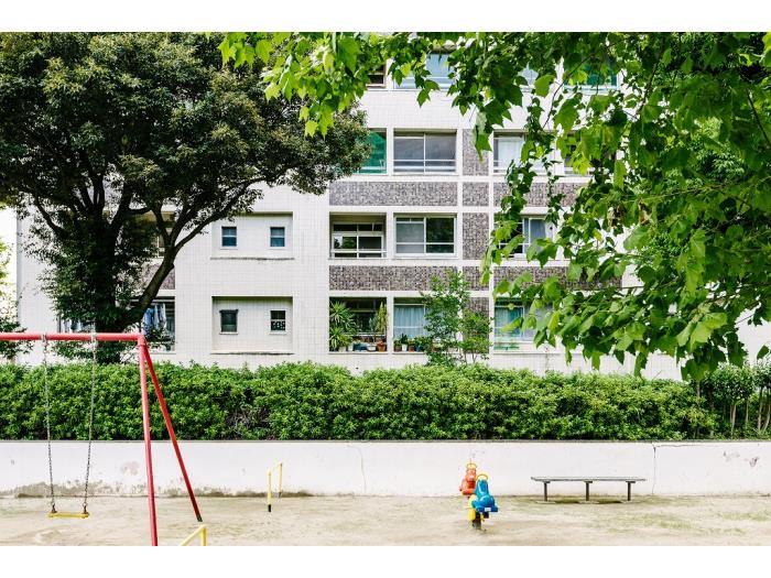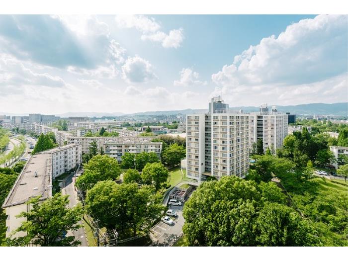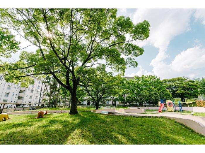大きな木々に囲まれた閑静な住環境が続く大規模物件。大きなスターハウス住棟など、建築の歴史も楽しめる物件です。阪急千里線「南千里」駅より歩行者道路から緑道で繋がり、のんびりした佇まいが人気です。